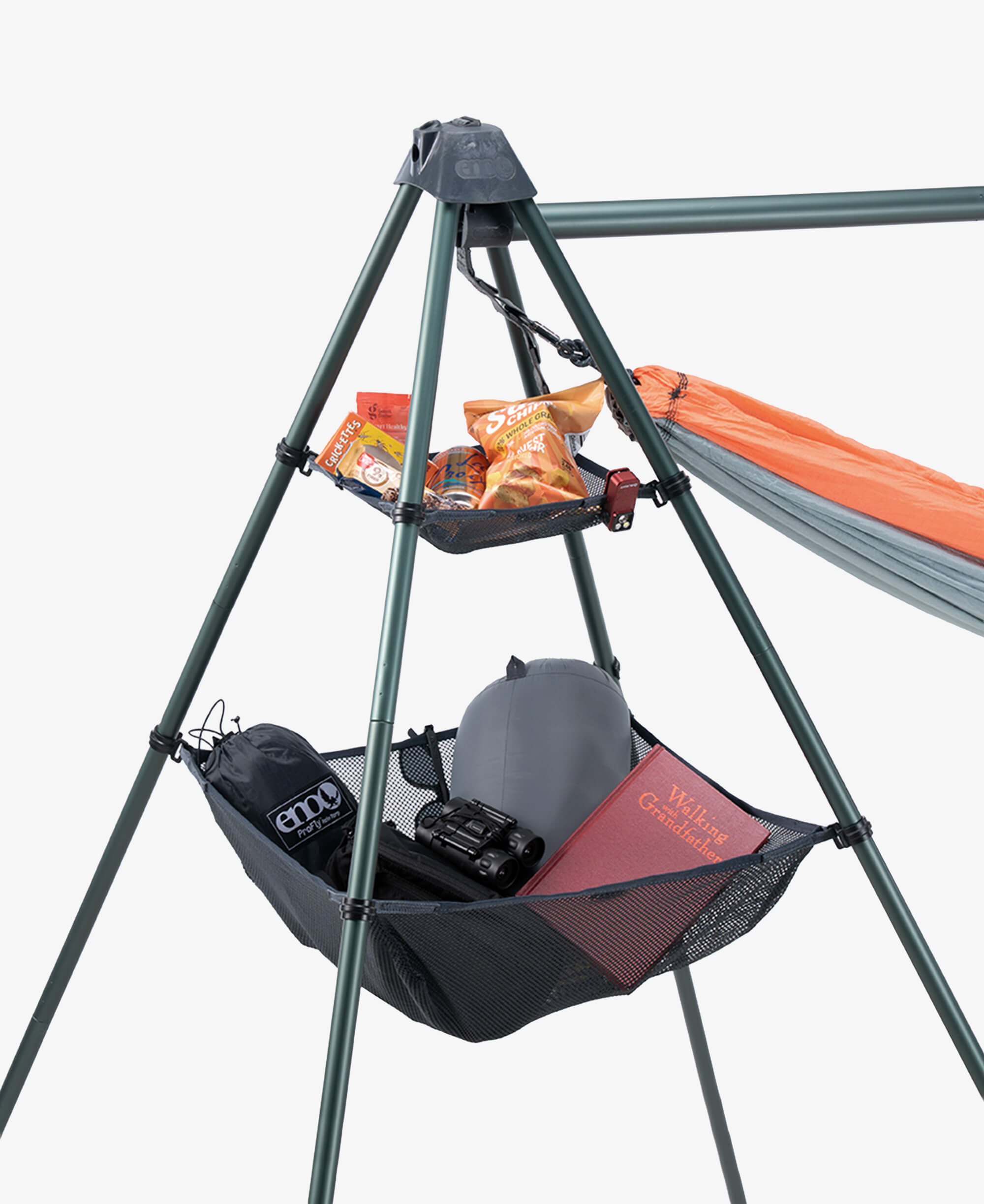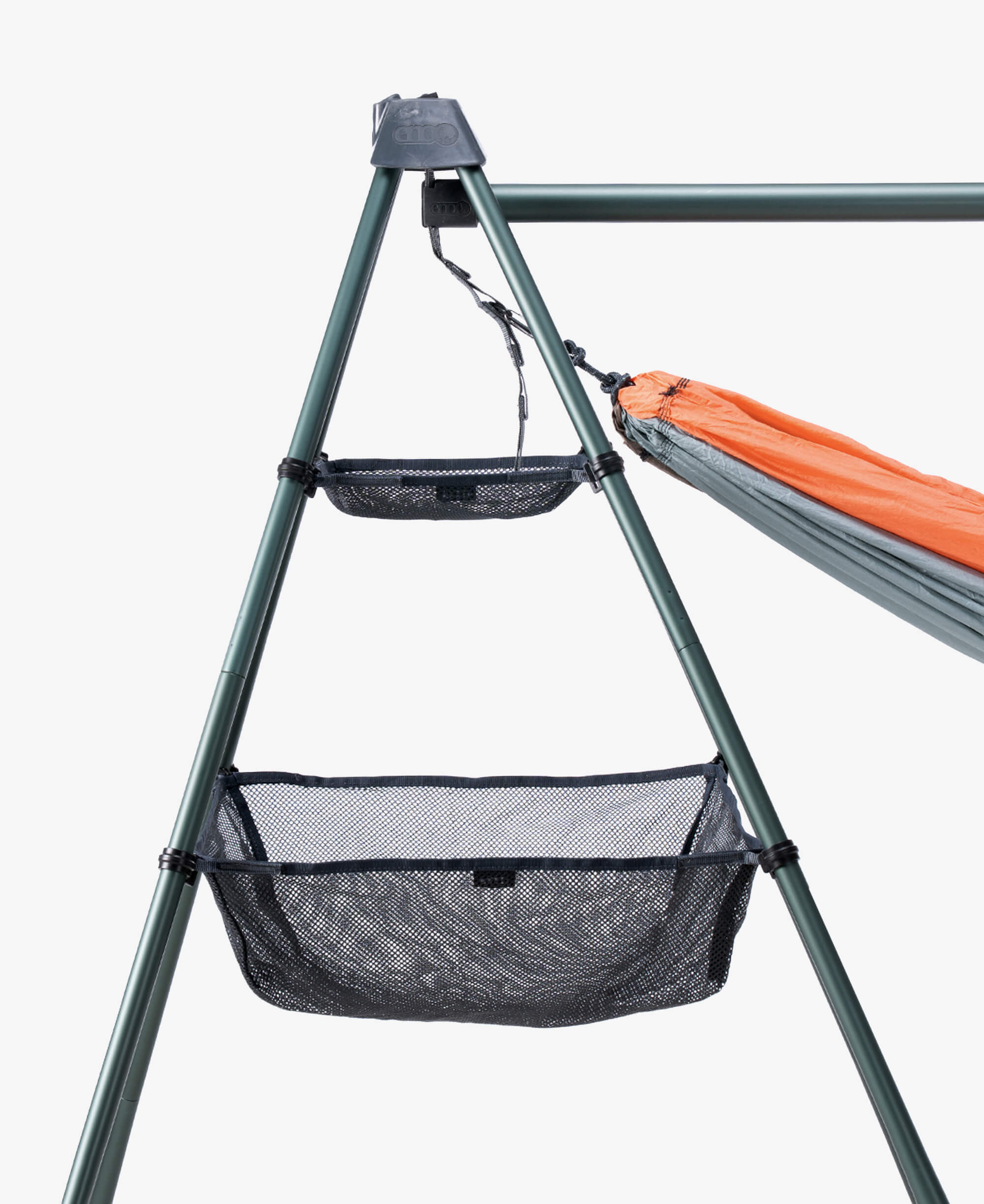The ENO Nomad Gear Loft attaches directly, via a clip system, to the four legs of either Nomad Hammock Stand frame.